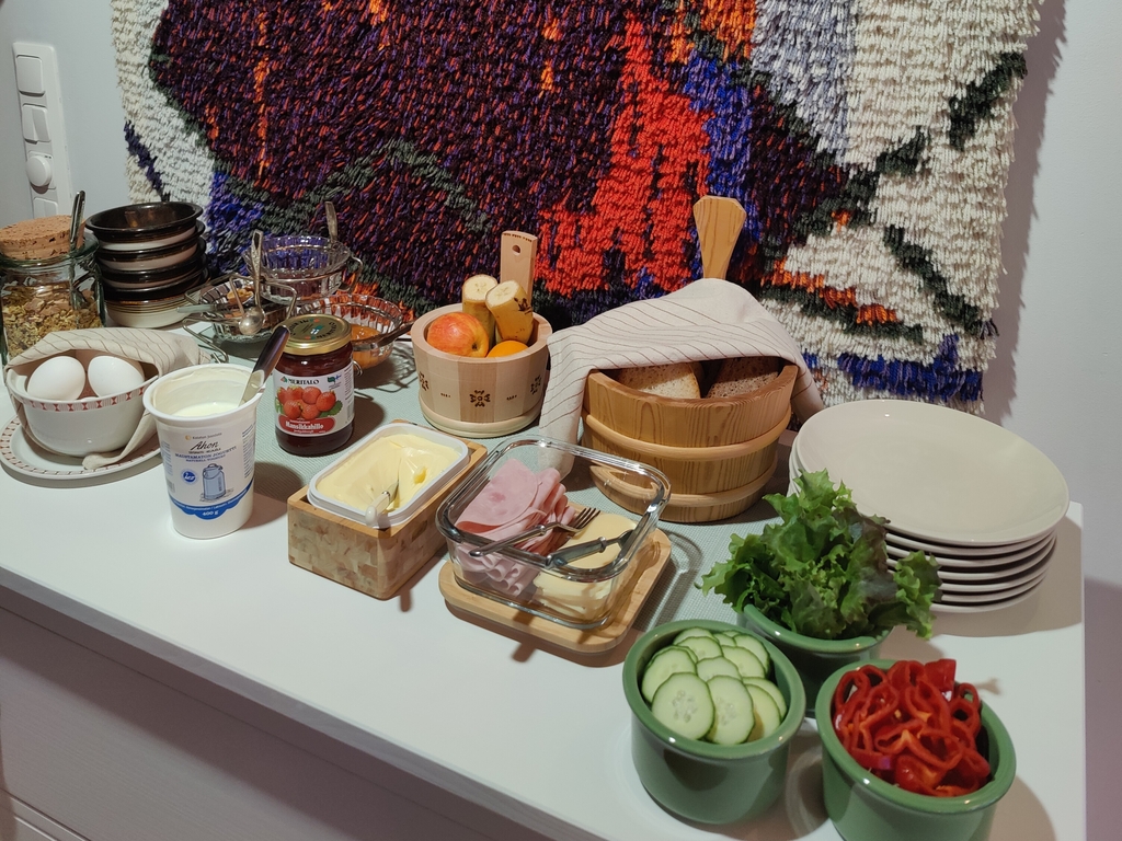 Aamiaisella on aina tarjolla kahvia, teetä ja mehua, paikallisen leipomon leipää, leikkeleitä ja vihanneksia sekä jugurttia ja mysliä lisukkeineen. Puuronsyöjille keitämme myös aamupuuron. Suosimme paikallisia tuotteita sekä luomu- ja reilun kaupan -tuotteita.